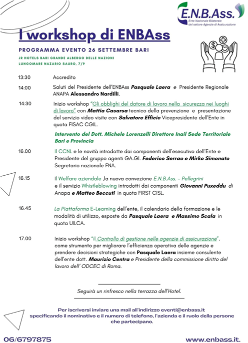 FNA è presente con un proprio delegato nel comitato esecutivo di E.N.B.Ass e collabora attivamente per promuovere l’ente con workshops ed eventi in giro per l’Italia. Dopo Roma, Napoli e la Sardegna è il momento della Puglia, dove Fna, assieme alle altre Organizzazioni Sindacali, sarà presente con gli agenti di Anapa per confrontarsi con l’unico obiettivo di trovare le soluzioni migliori per le lavoratrici e i lavoratori per tutto quello che riguarda i servizi di E.N.B.Ass.